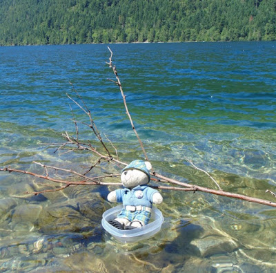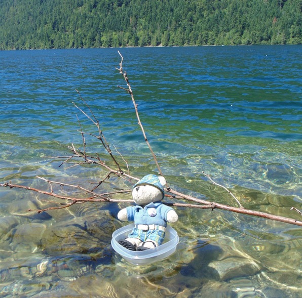 And last, but not least, is Sandy Bear in a “boat” relaxing on a river. Sandy took a little bit of a bath in this lake, heh heh…