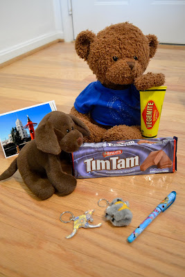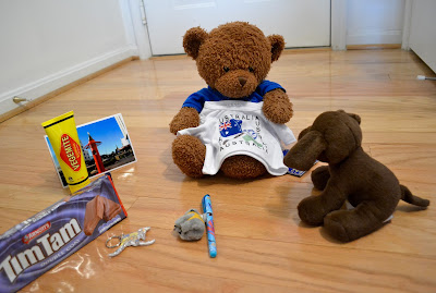 “Everything here is from Australia. Let’s see, we’ve got Tim Tams, Vegemite, a cool pen, and some neat keychains of a kangaroo and a koala.”