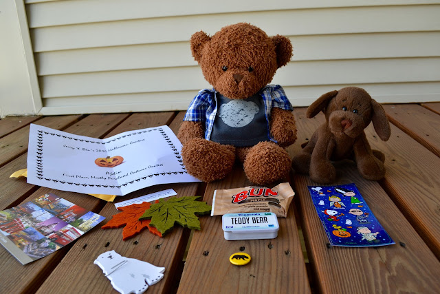 They sent me a bunch of fun stuff from their Halloween Costume Contest. There’s a certificate, some stickers, a bear pin, some bear stationery, leaf coasters, candy, and teddy bear mints!