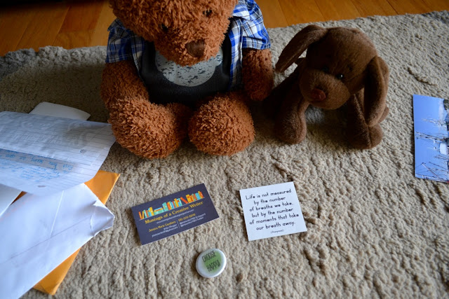 We also received a letter and some goodies from my friend Jessica. Jessica is a beary creative writer, and she included some stickers and her business card also.