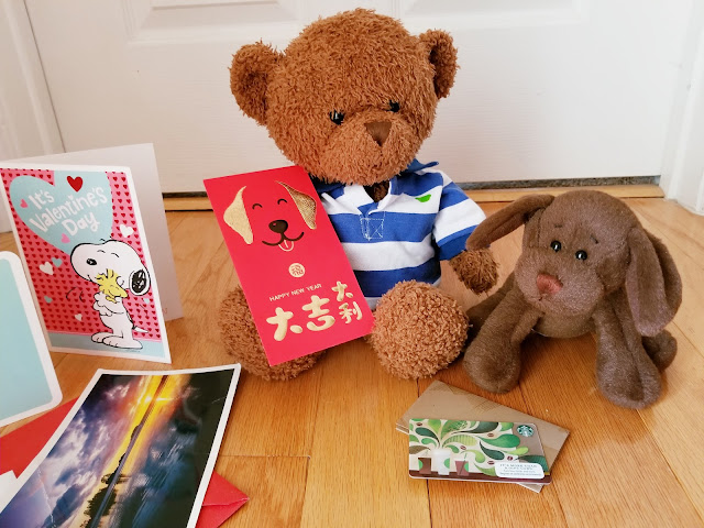 In the Chinese New Year tradition, people (and stuffies) exchange red envelopes with money inside. It’s a gift to wish everyone a prosperous new year. There was a Starbucks gift card inside this card! Thanks Droopy!