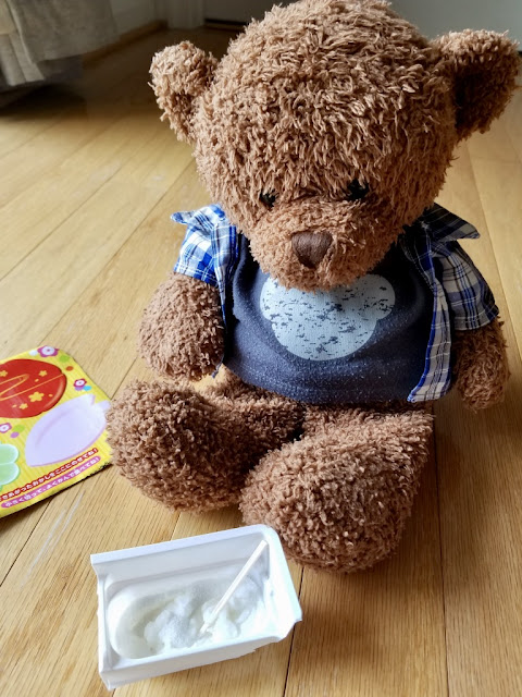 I am really winging it here, folks. Okay, now I am going to make the fish-shaped cookies. I put the mixture into a mold. Then I put it in the microwave for 15 seconds.