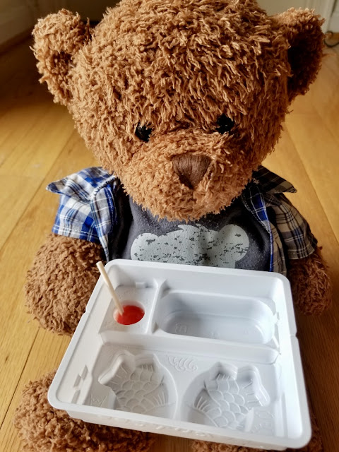I am really winging it here, folks. Okay, now I am going to make the fish-shaped cookies. I put the mixture into a mold. Then I put it in the microwave for 15 seconds.