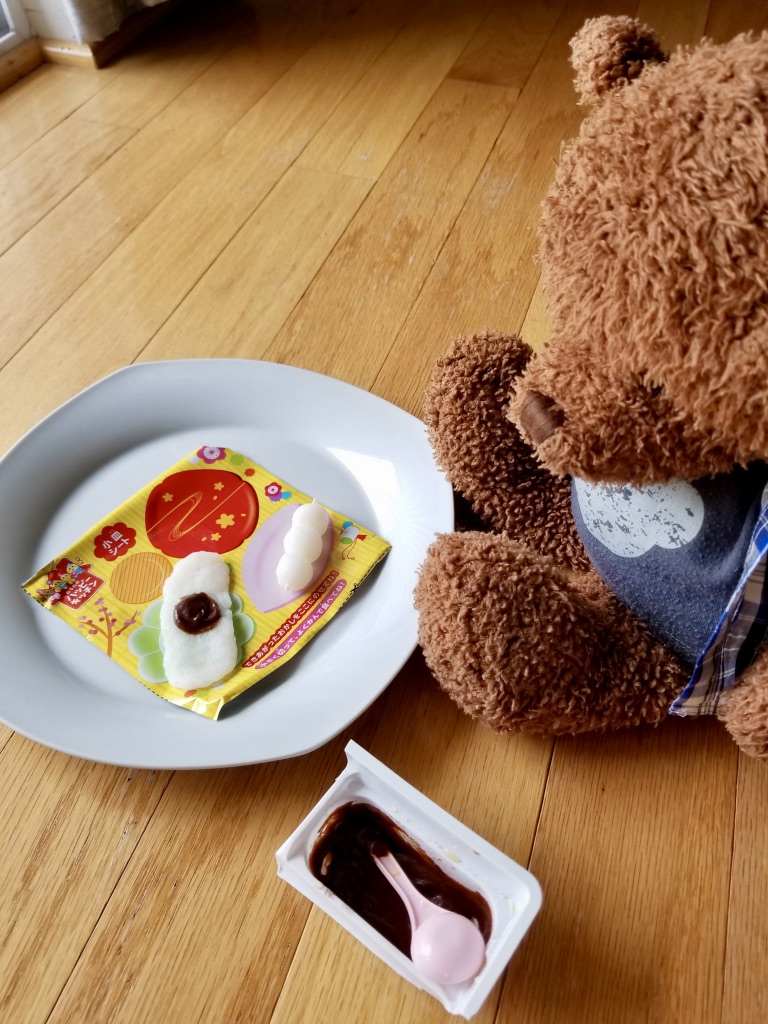 Next, I’m going to start arranging the food onto a plate. Presentation is everything, you know. Some of the white dough is stretched out and I add a dollop of chocolate on top.