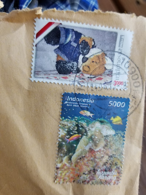 On the envelope, I noticed that he also has his own postage stamp. It looks like he is attempting to do a cartwheel or flip or some kind.