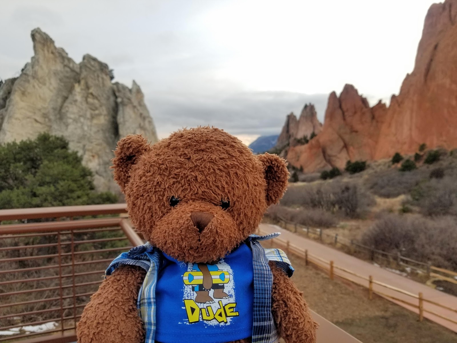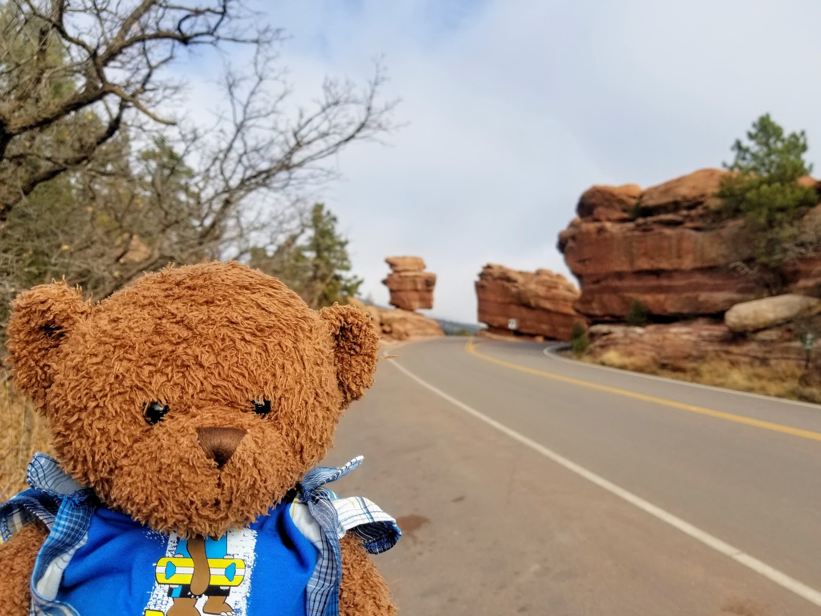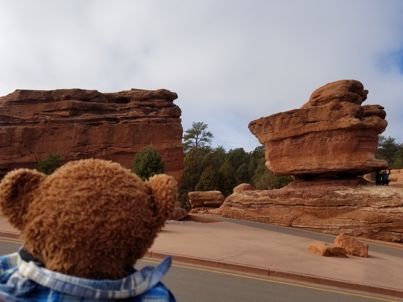This formation is called Balanced Rock, and I can see why! In this photo, looks like some people are trying to hold the rock up. Do you think a stuffie can be strong enough to do that? Maybe Uncle Tibbs can lift it.