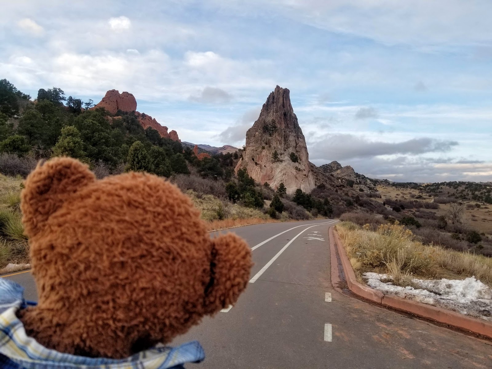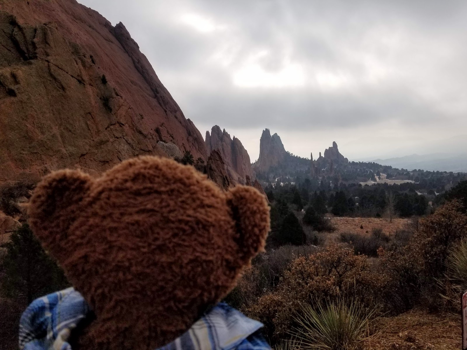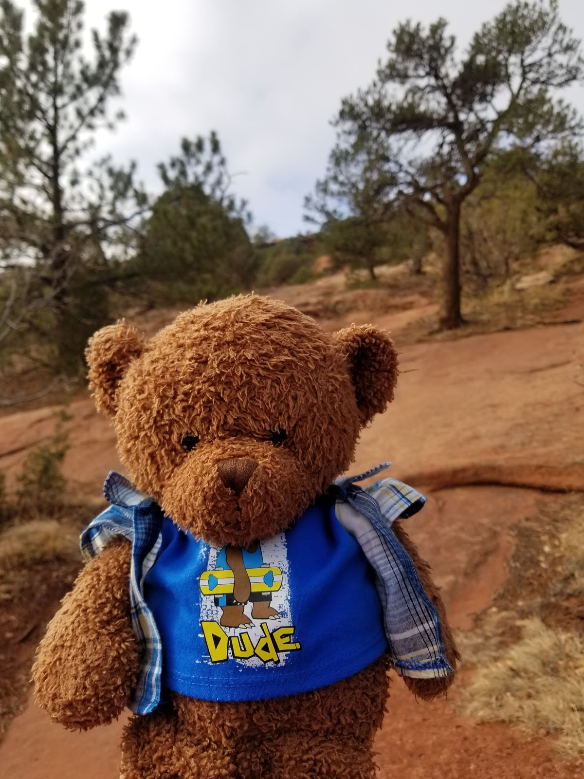 This formation is called Balanced Rock, and I can see why! In this photo, looks like some people are trying to hold the rock up. Do you think a stuffie can be strong enough to do that? Maybe Uncle Tibbs can lift it.