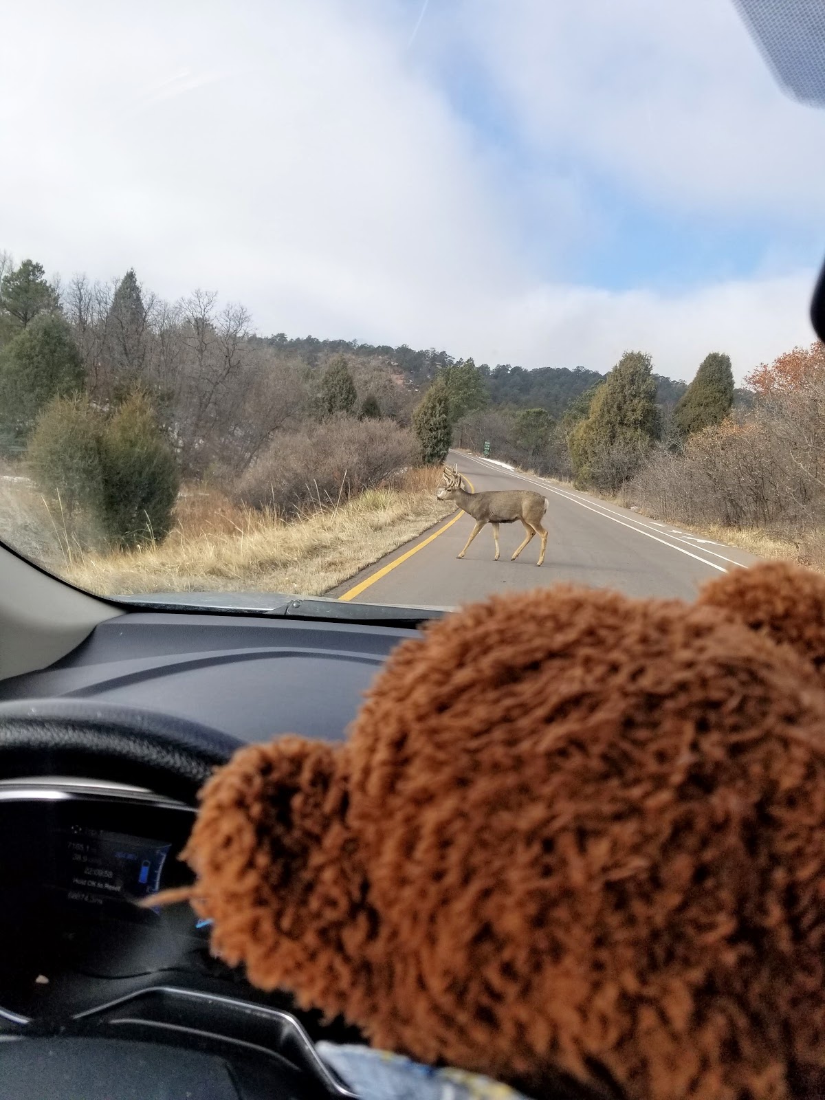 While I was driving, a mule deer crossed the road. They may look like deer at first, but their tails have a black tip on the end and the tend to be a bit bigger than white-tailed deer.