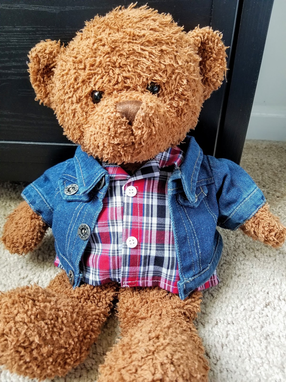 The red plaid shirt has small buttons on the front. And the denim jean jacket is really detailed with two little pockets on the front – a great fit!