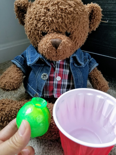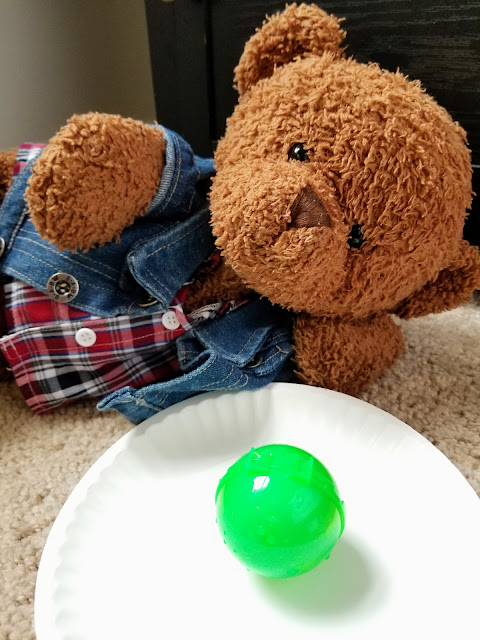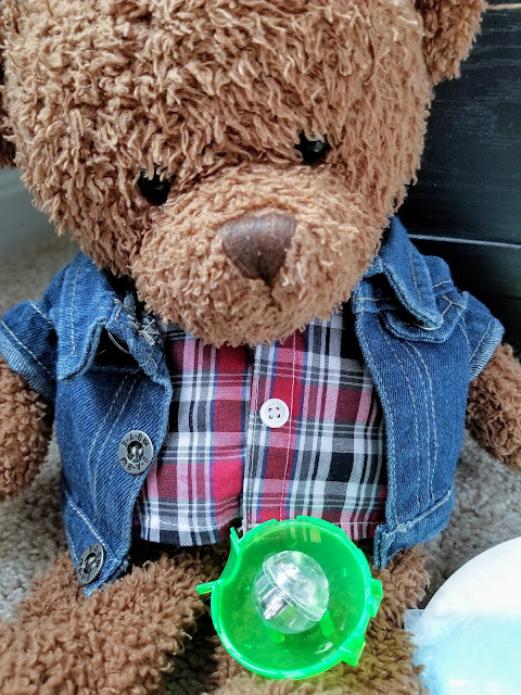 For starters, I’m going to put everything on a plate for easier cleanup. We have several pouches of what looks like small plastic pellets, a ball mold, and the light up battery part.