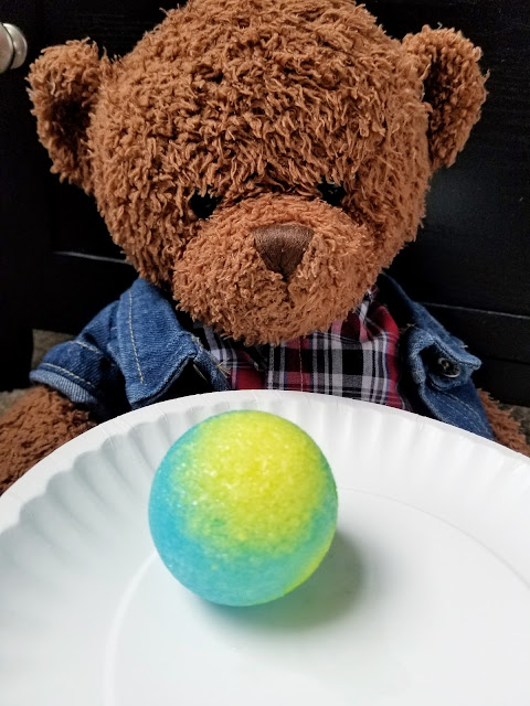 Now I can finally open the mold to see the finished bouncy ball. Voilà! It’s an interesting mix of blue, green, and yellow colors. When I bounce it on the hard ground, it lights up for about 10 seconds. Cool!