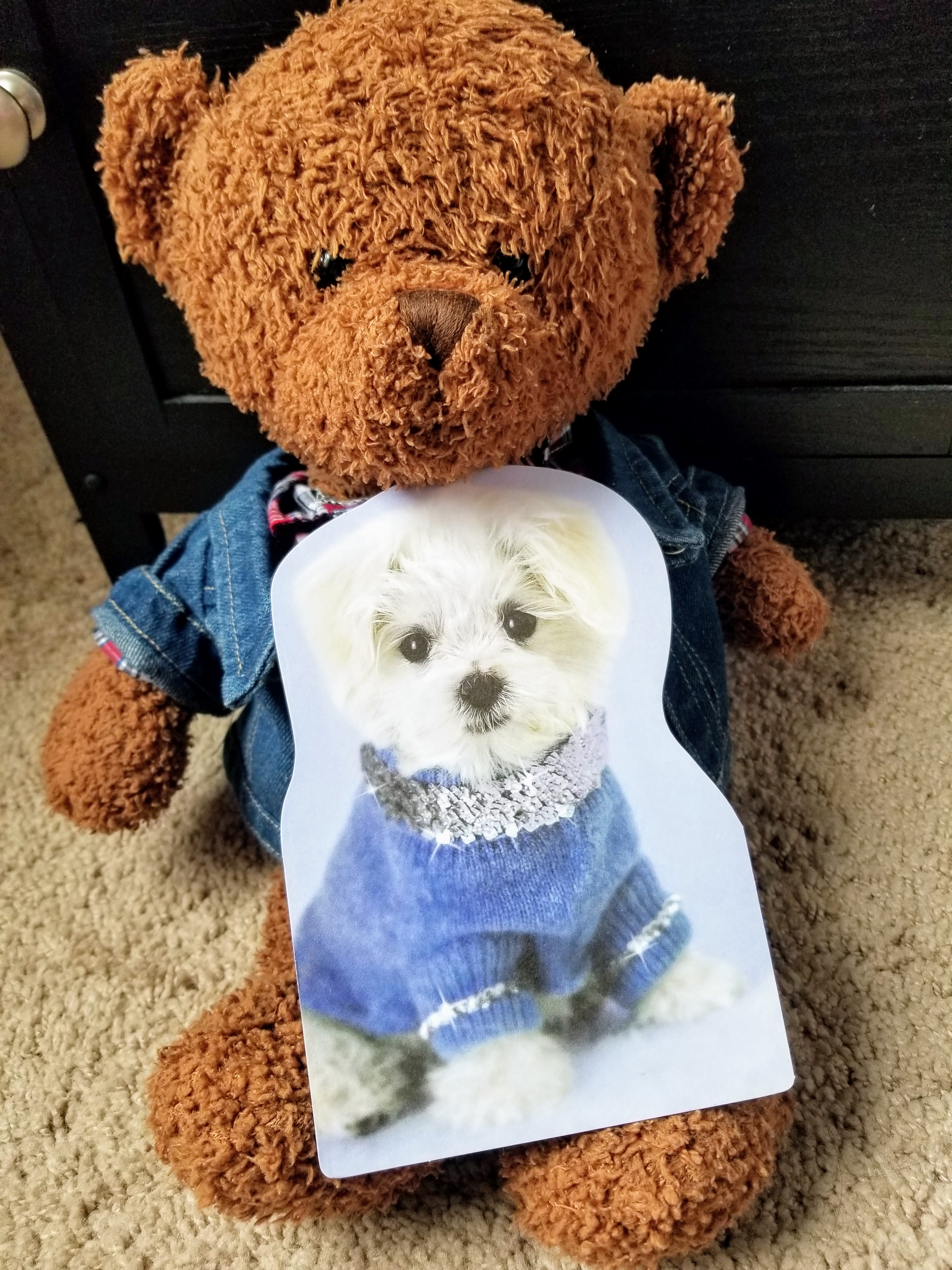 I received a card a little while ago from my friend Jessica! I think it was delayed in the mail for a bit, because it’s a New Year’s greeting card. But, better late than never, right? Look at this absolutely adorable doggie in a cute sweater. Maybe I should get Parker a sweater this?