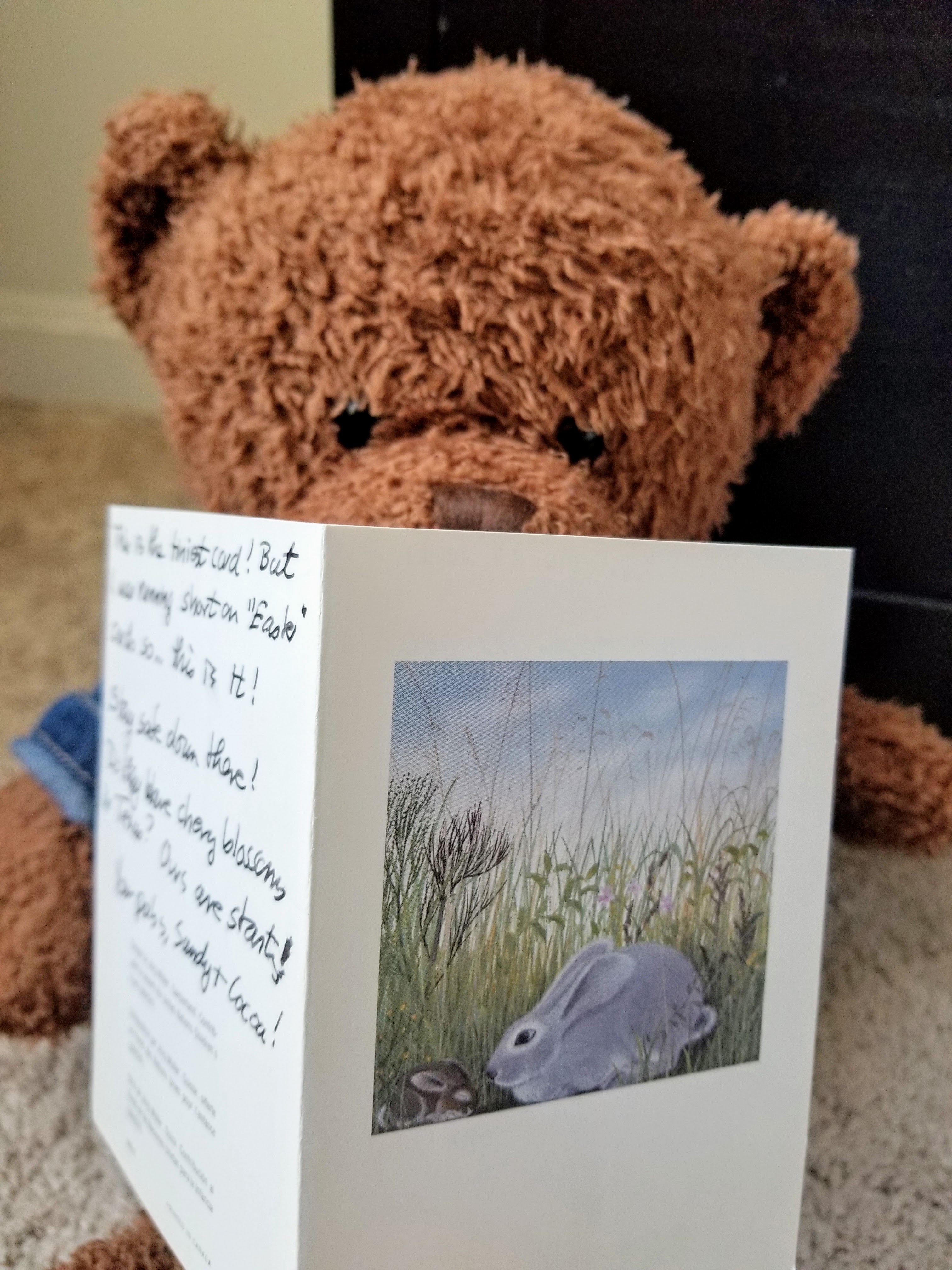 Oh, it’s a lovely Easter card with a bunny on the front. How nice! Sandy says he is doing a lot of exploring and hiking lately, and will be supervising some house renovation projects.