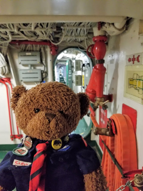 Now we’re going inside the deck to see some of the other exhibits. If you’re claustrophobic, maybe you should wait outside. And watch your head and your knees! We will be climbing through some small entryways that are designed for sealing off any water leaks.